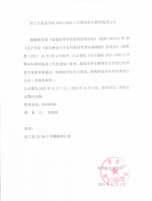 轻工与食品学院2025-2026-2学期本科生教材选用公示