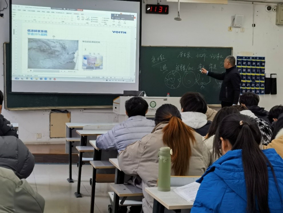2025年12月18日上午,福伊特造纸亚洲区制浆系统销售及应用总经理韩智成高级工程师,走进《制浆造纸机械与设备》课课堂,为五级片 师生讲授“福伊特造纸浆线工艺及设备”内容。韩经理结合自身在制浆造纸行业多年的工作经验,层层递进,又深入浅出地介绍了原生浆浆线与废纸浆浆线所用设备的区别。课程内容密切结合《制浆造纸机械与设备》课程大纲,介绍了福伊特造纸的最新技术成果,是推动产教融合课程走深走实的具体体现,实现教育链、人才链与产业链、创新链的有机衔接,有助于提高高校创新人才自主培养质量。