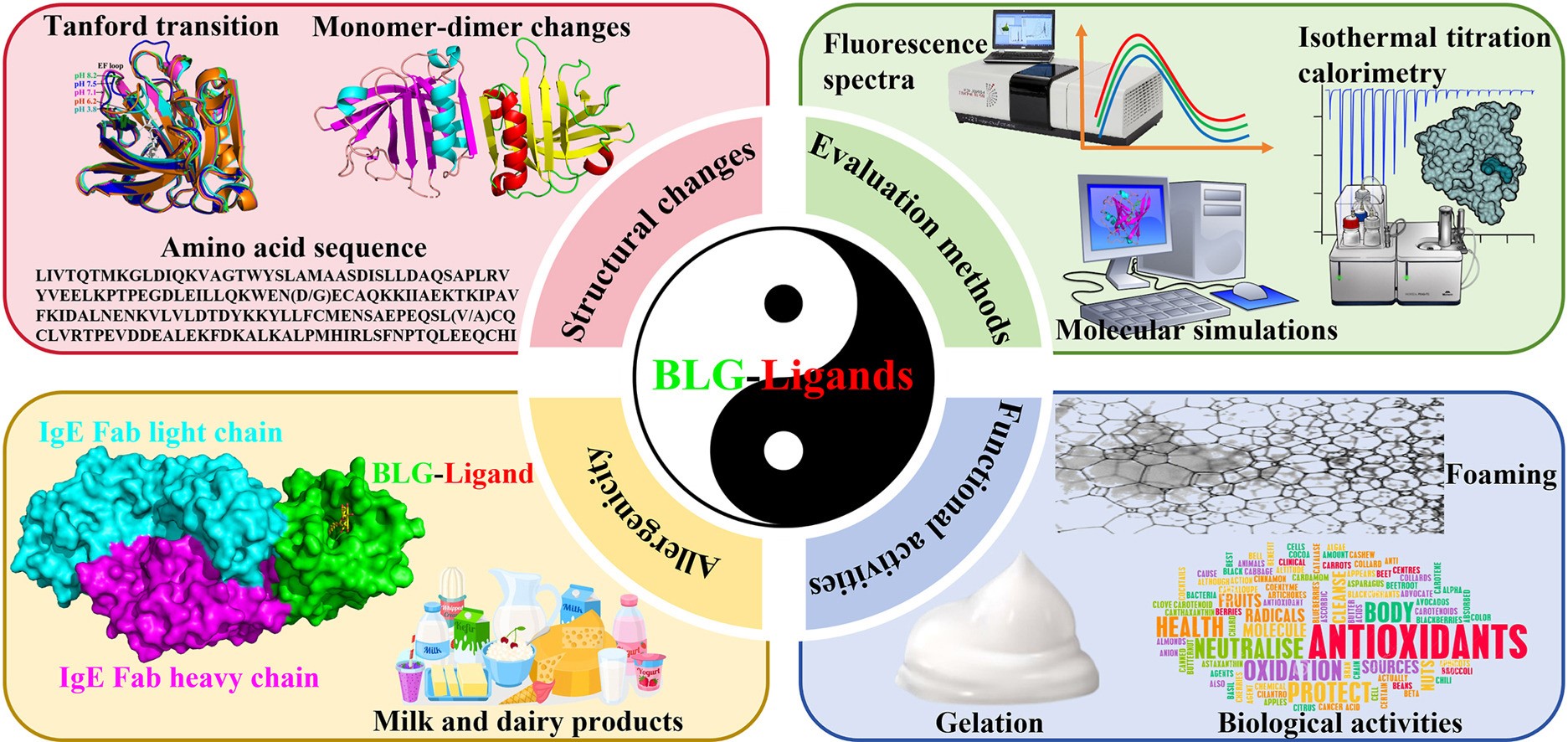 该综述文章系统阐述了牛乳中主要乳清蛋白——β-乳球蛋白(BLG)与食物中各类活性成分的非共价相互作用的分子机制及其功能应用前景,为开发新型营养强化食品和低致敏性乳制品提供了理论依据和创新思路。BLG是乳清蛋白的主要成分,其独特的“β-桶”状三维结构形成一个疏水空腔,可高效承载脂肪酸、维生素、多酚等多种营养素及风味物质。团队深入论述了pH值如何精确调控蛋白质构象变化,进而影响其与配体的结合能力、结合位点及复合物稳定性。研究揭示,通过形成BLG-配体复合物,可显著提高脂溶性营养素等在加工和储运过程中的稳定性、溶解性与生物利用度。同时,该综述也重点探讨了复合物的形成对BLG自身致敏性的调节作用。研究表明,某些活性成分与BLG结合后,可能遮蔽或改变其抗原表位,从而有望降低主要牛奶过敏原BLG的致敏风险。这为通过天然配体相互作用策略减轻乳蛋白过敏反应提供了新视角。这些研究成果不仅进一步深化了对食物分子间相互作用的基础认识,更在功能性乳制品开发、营养素高效递送体系构筑以及食品安全性提升等方面展现出良好的应用潜力。